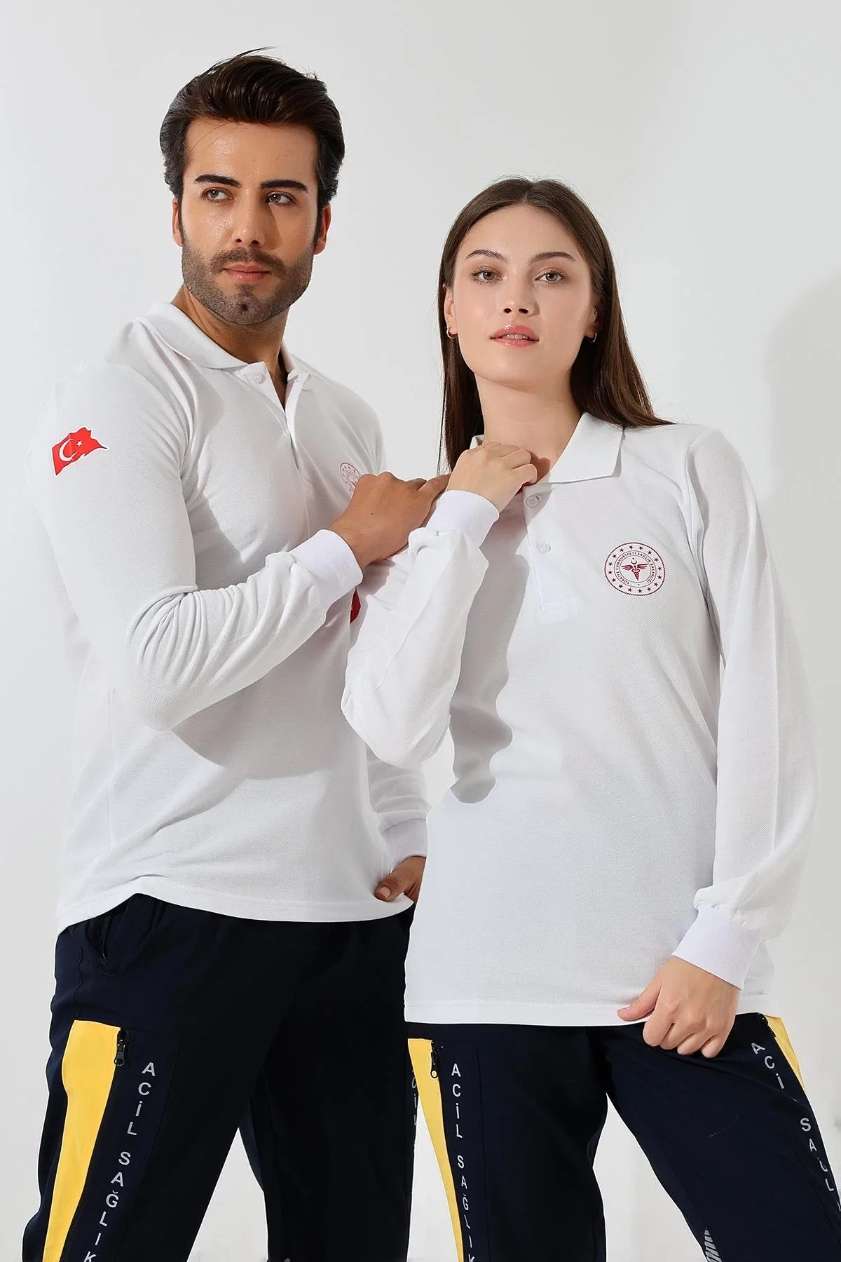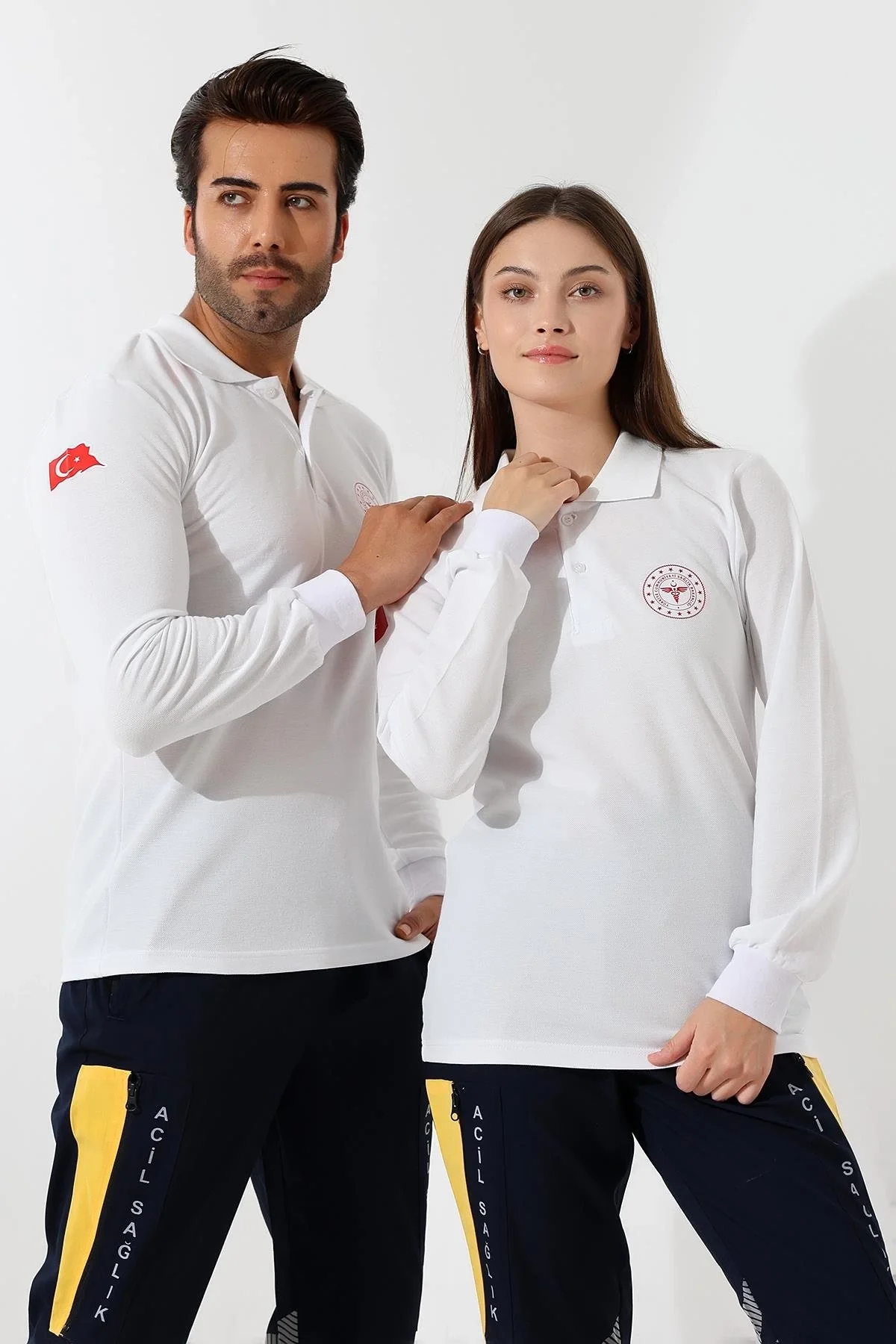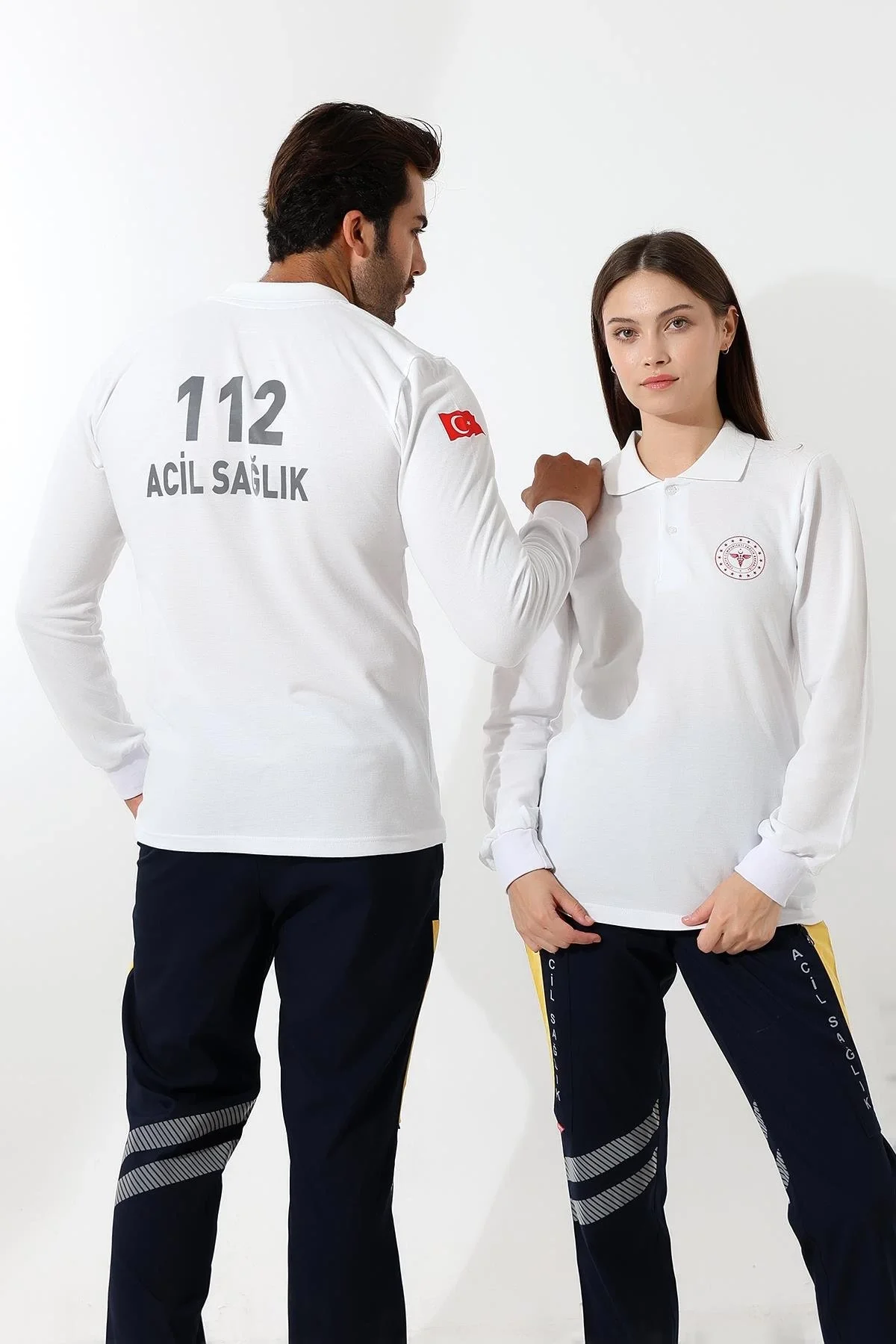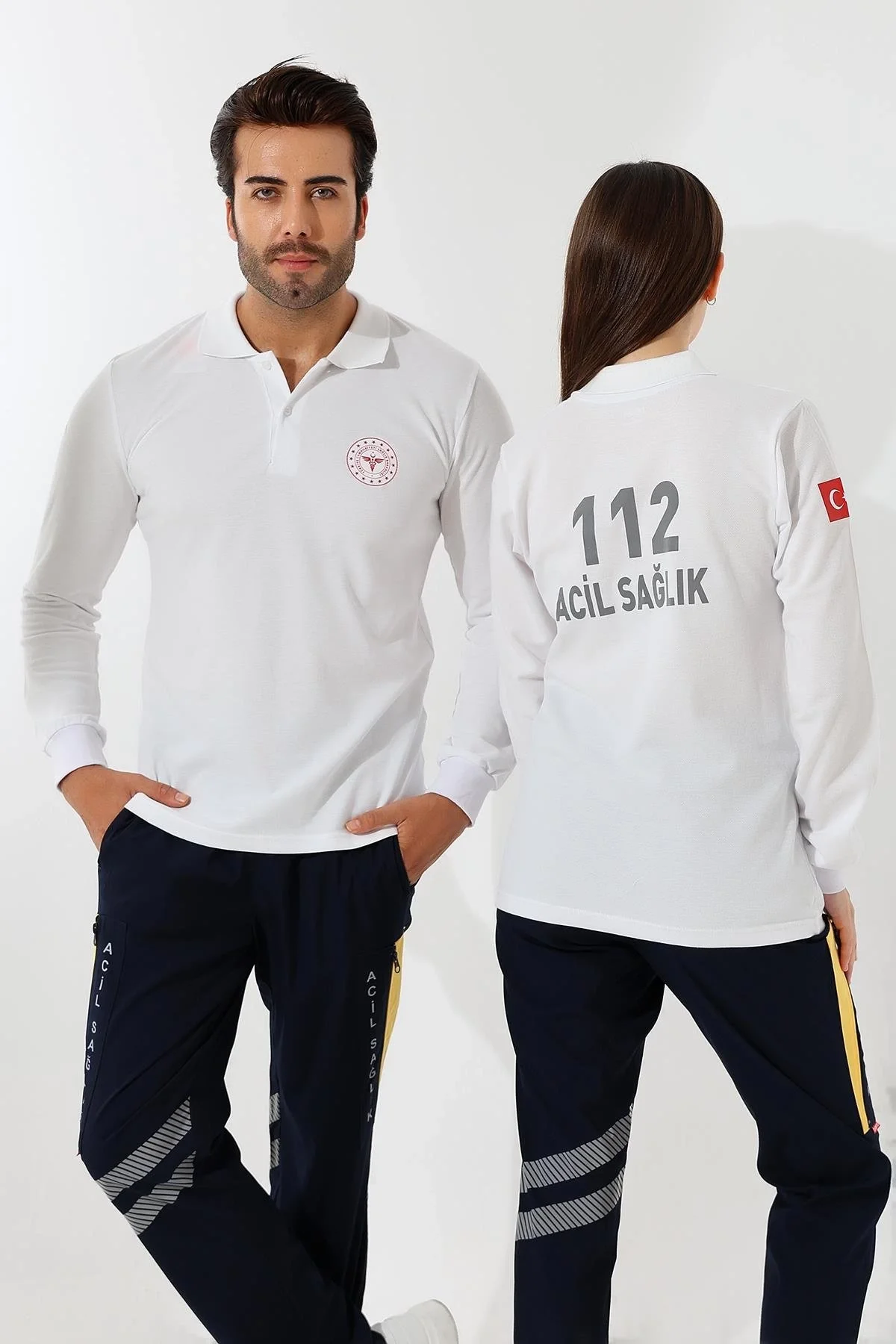 112 Acil Sağlık Yakalı Tshirt Kısa Kol Baskılı - Beyaz