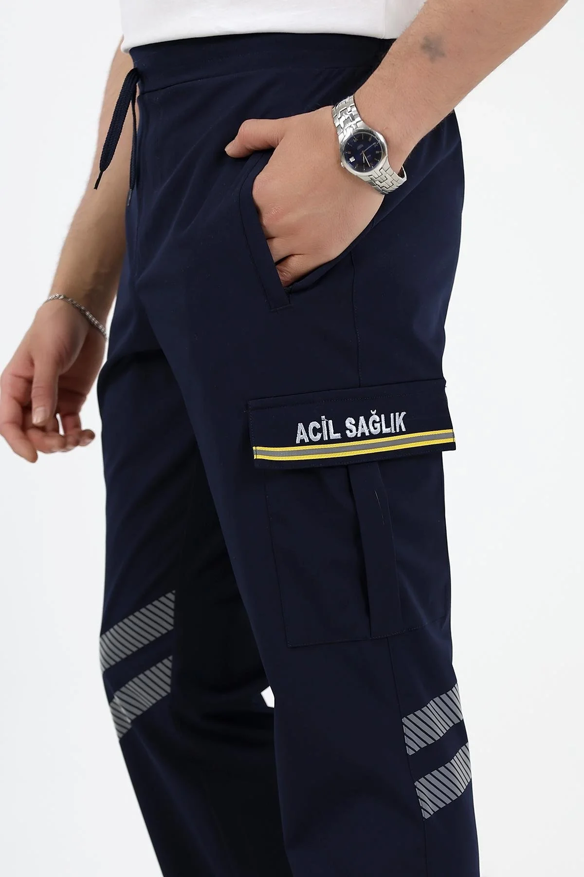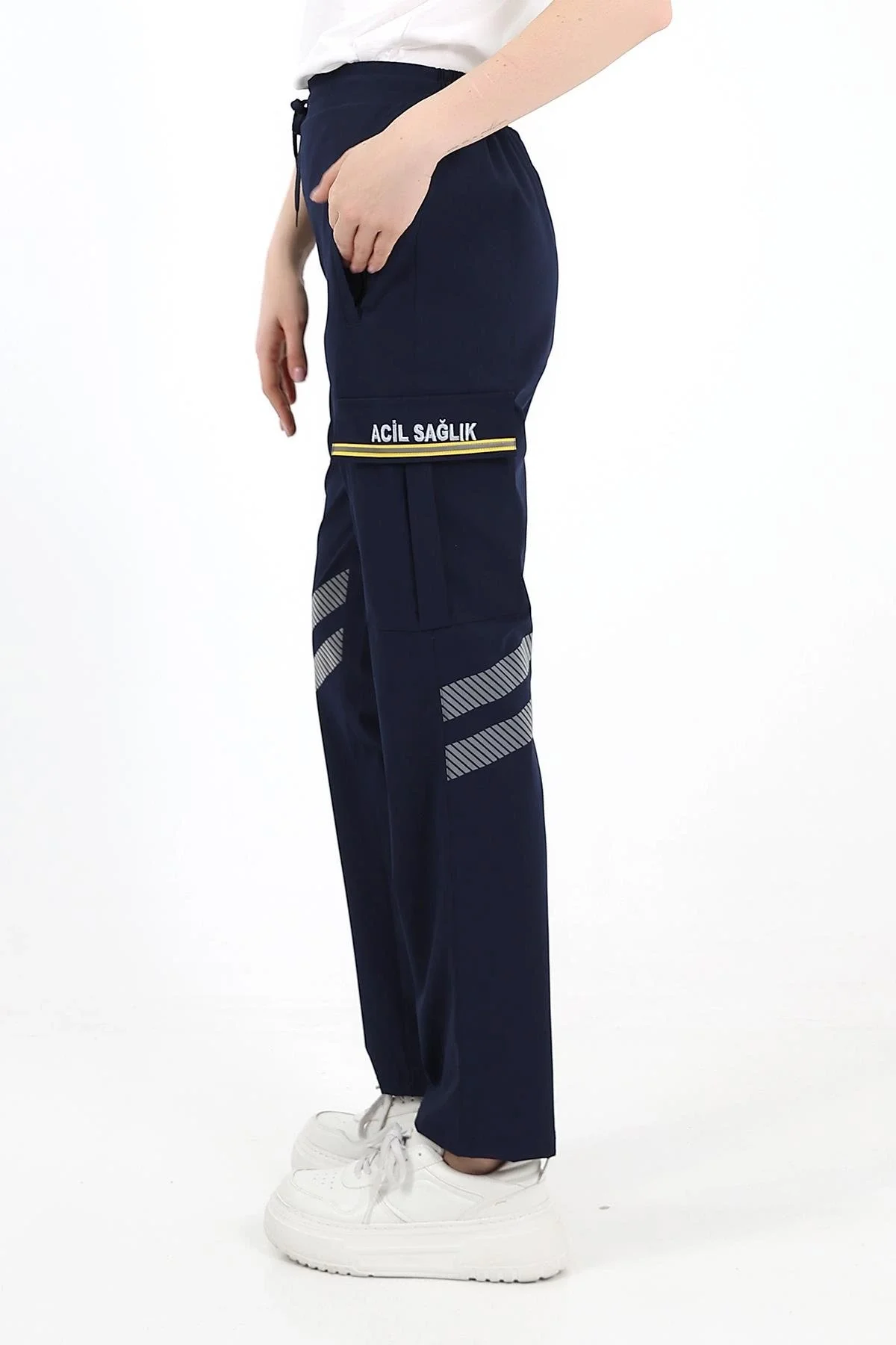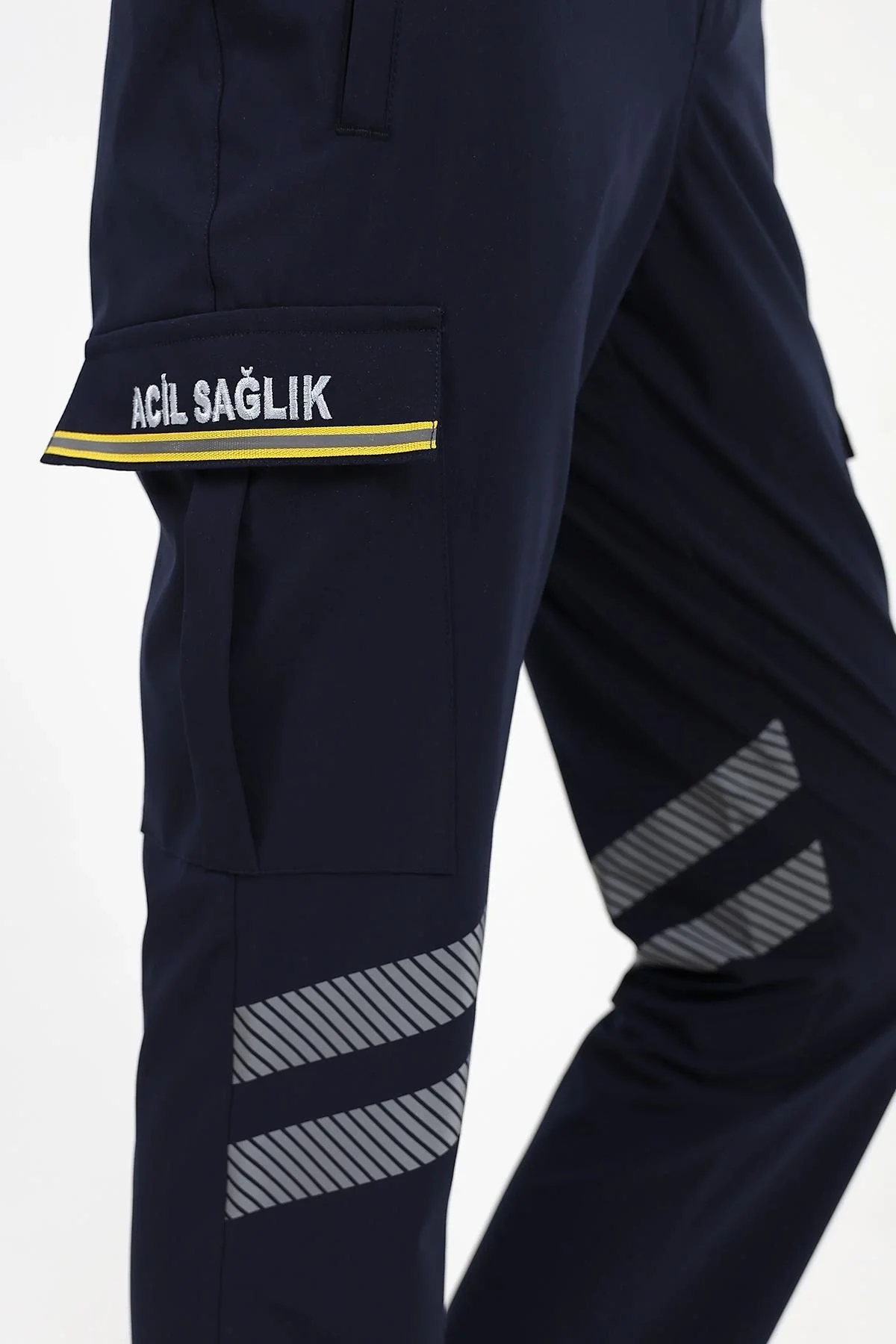Ön sağ bacakta ve arka sol bacakta kumaşın esnekliğini etkilemeyen kesik kesik çizgili yüksek yansıtma özelliğine sahip 2 şer sıra reflektif şeritler bulunmaktadır.