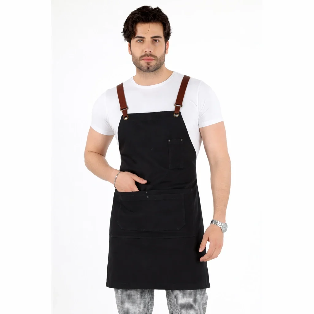 Barista Askılı Önlük Çift Cepli Deri Kemerli Siyah