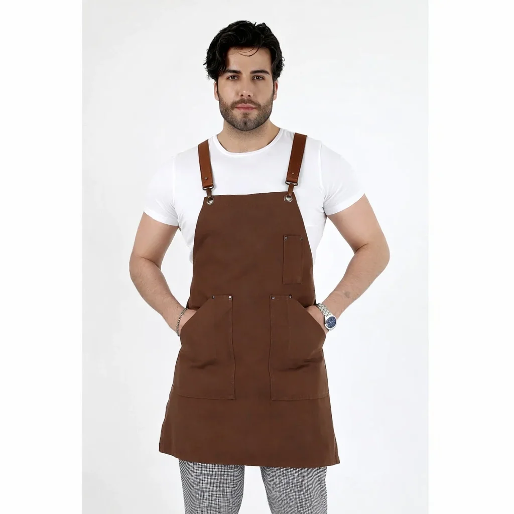 Barista Askılı Önlük Çift Cepli Deri Kemerli - Kahve