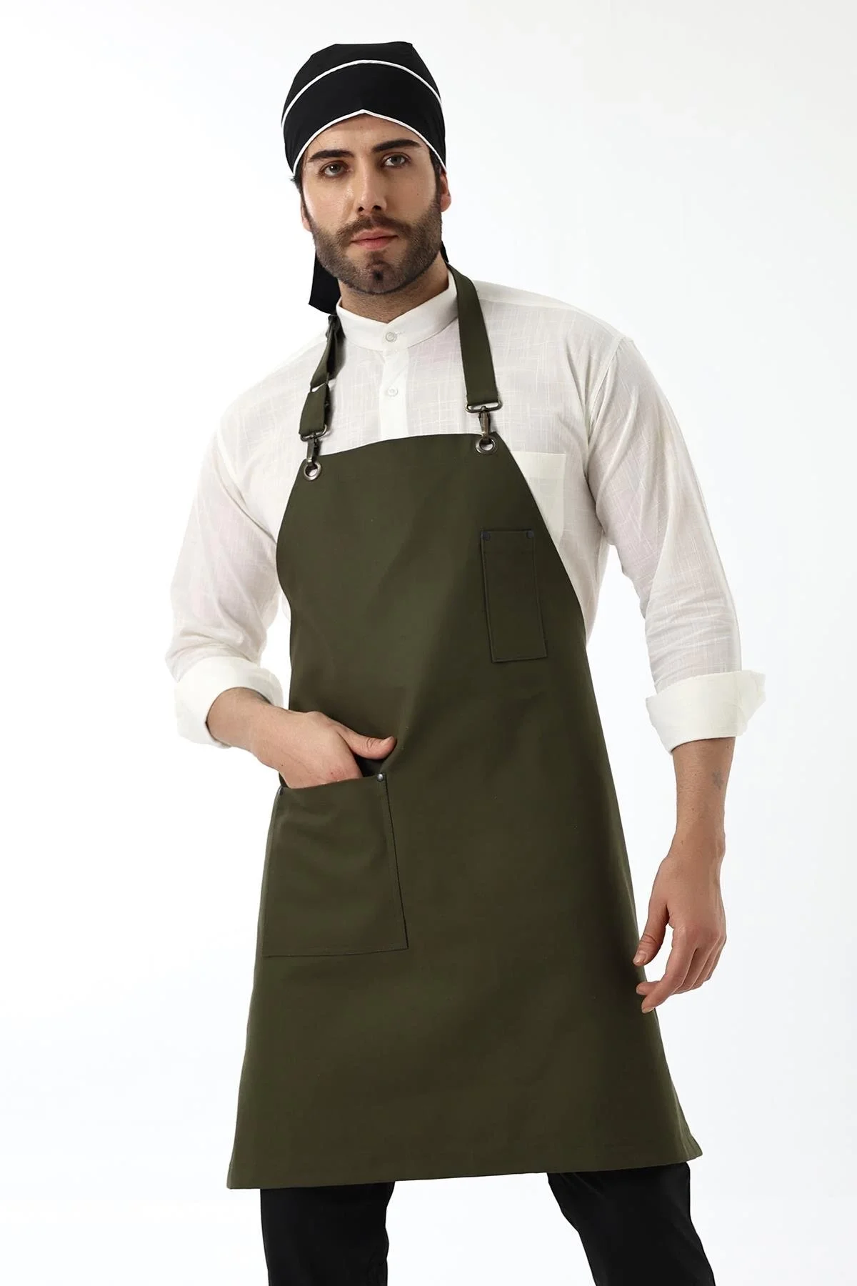 Barista Askılı Önlük Tek Cepli Deri Kemerli - Yeşil