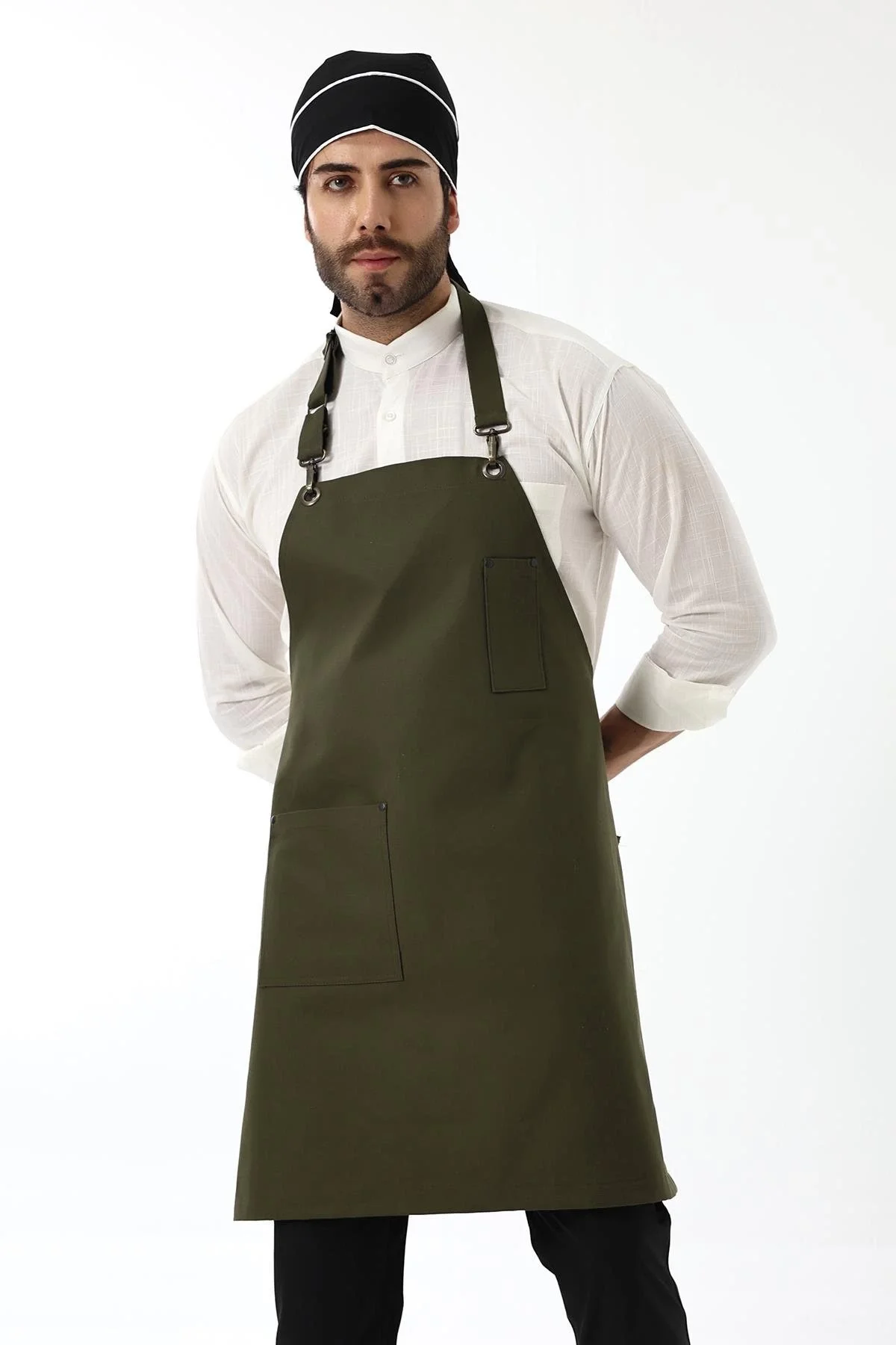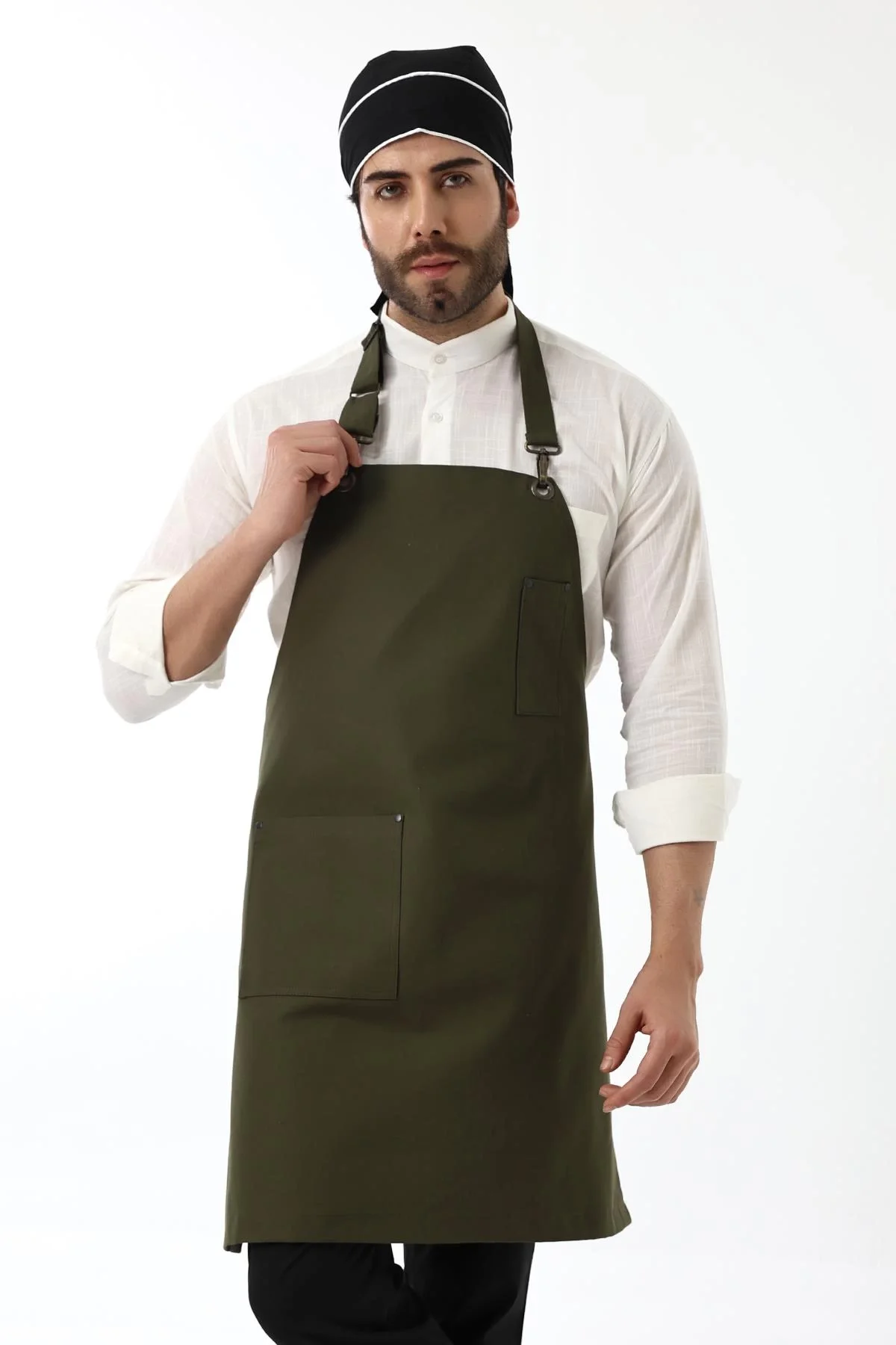 Barista Askılı Önlük Çift Cepli Deri Kemerli Yeşil