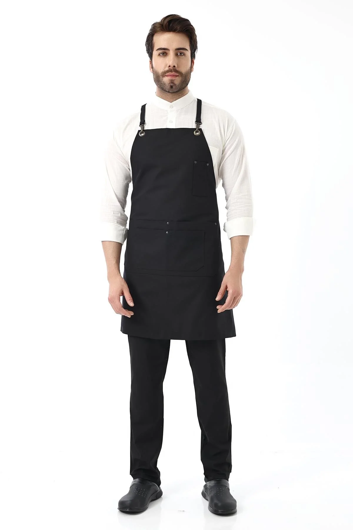 Barista Askılı Önlük Çift Cepli Deri Kemerli Siyah