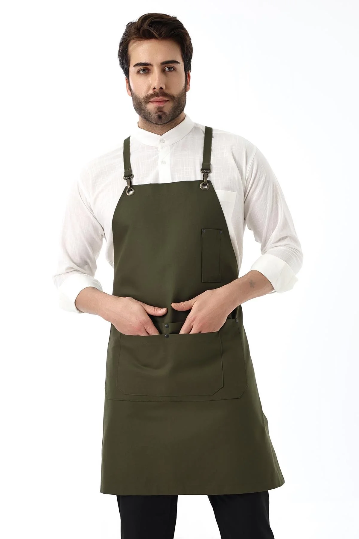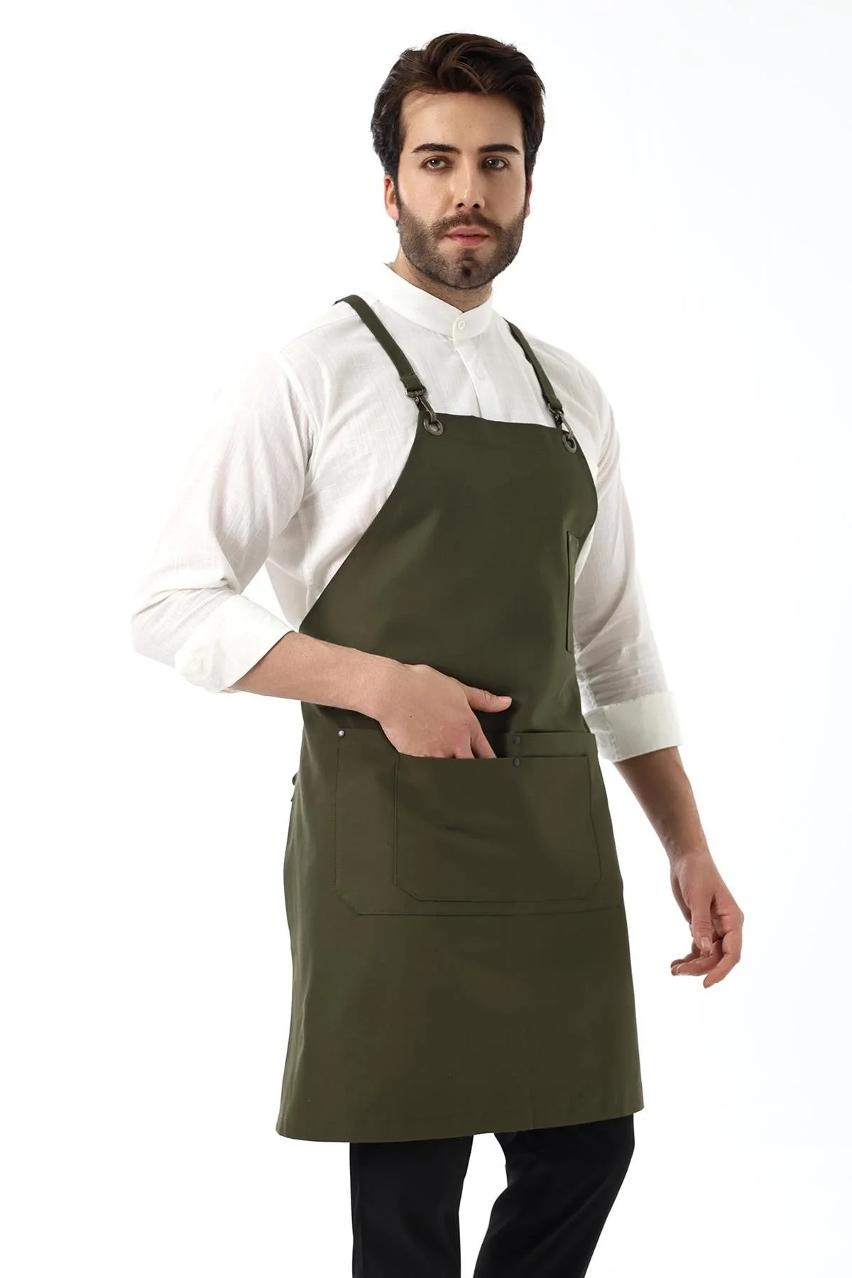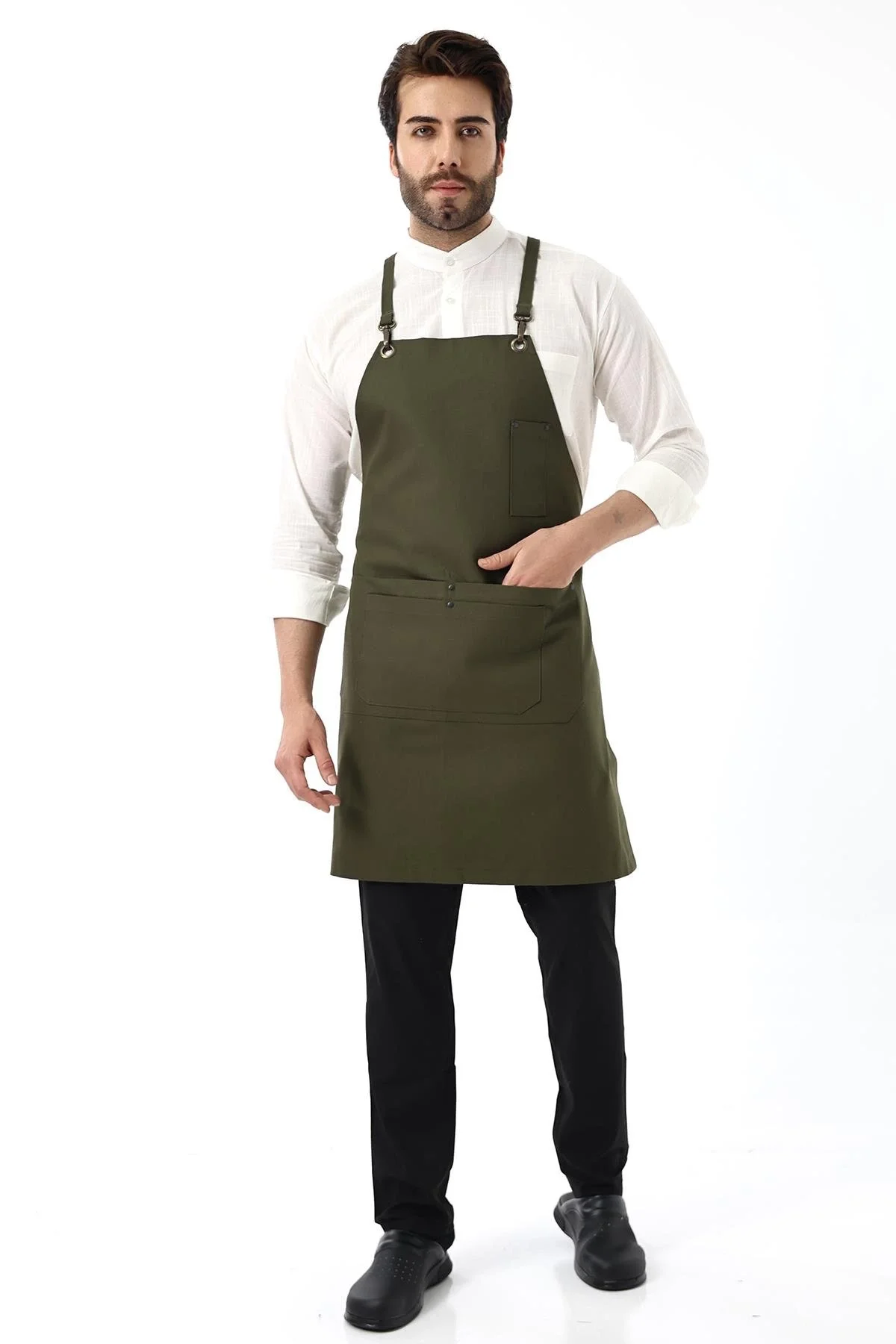 Barista Askılı Önlük Çift Cepli Deri Kemerli Yeşil