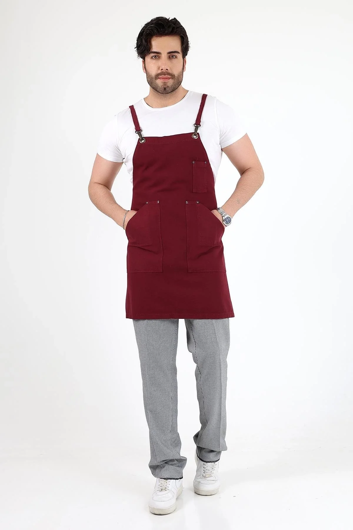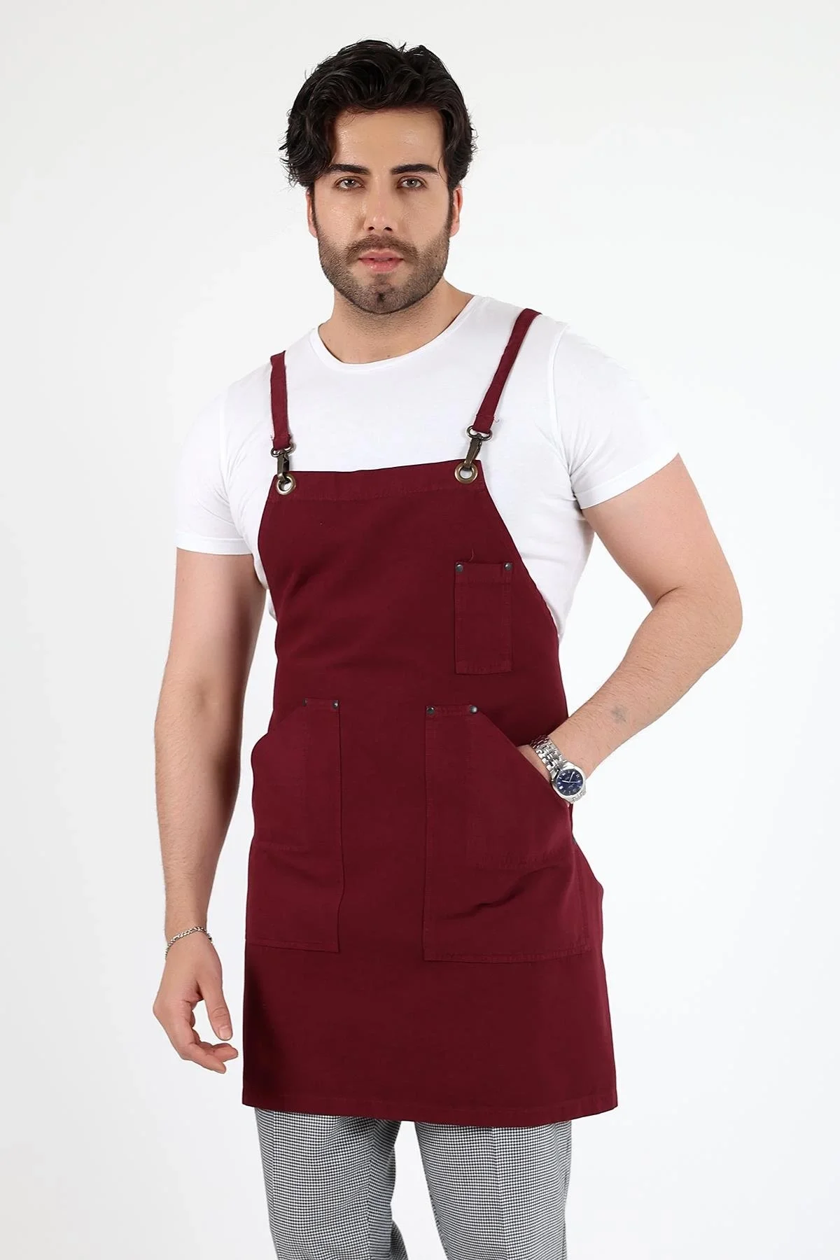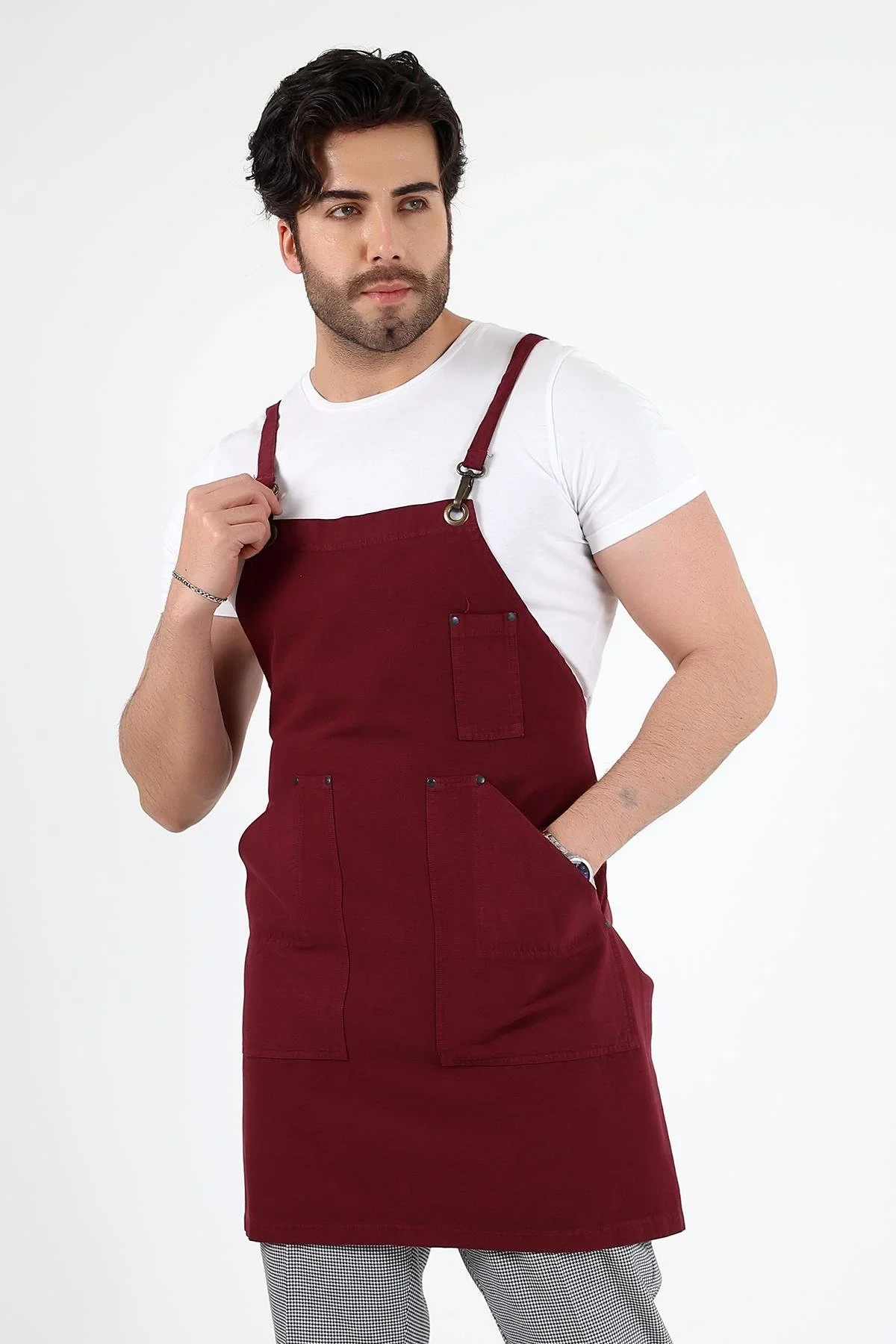 Barista Askılı Önlük Çift Cepli Deri Kemerli Bordo