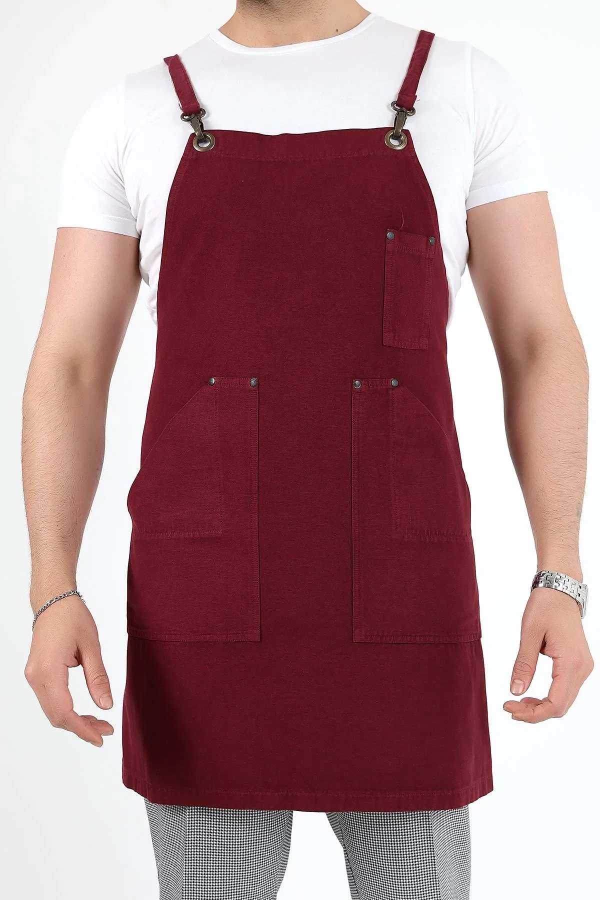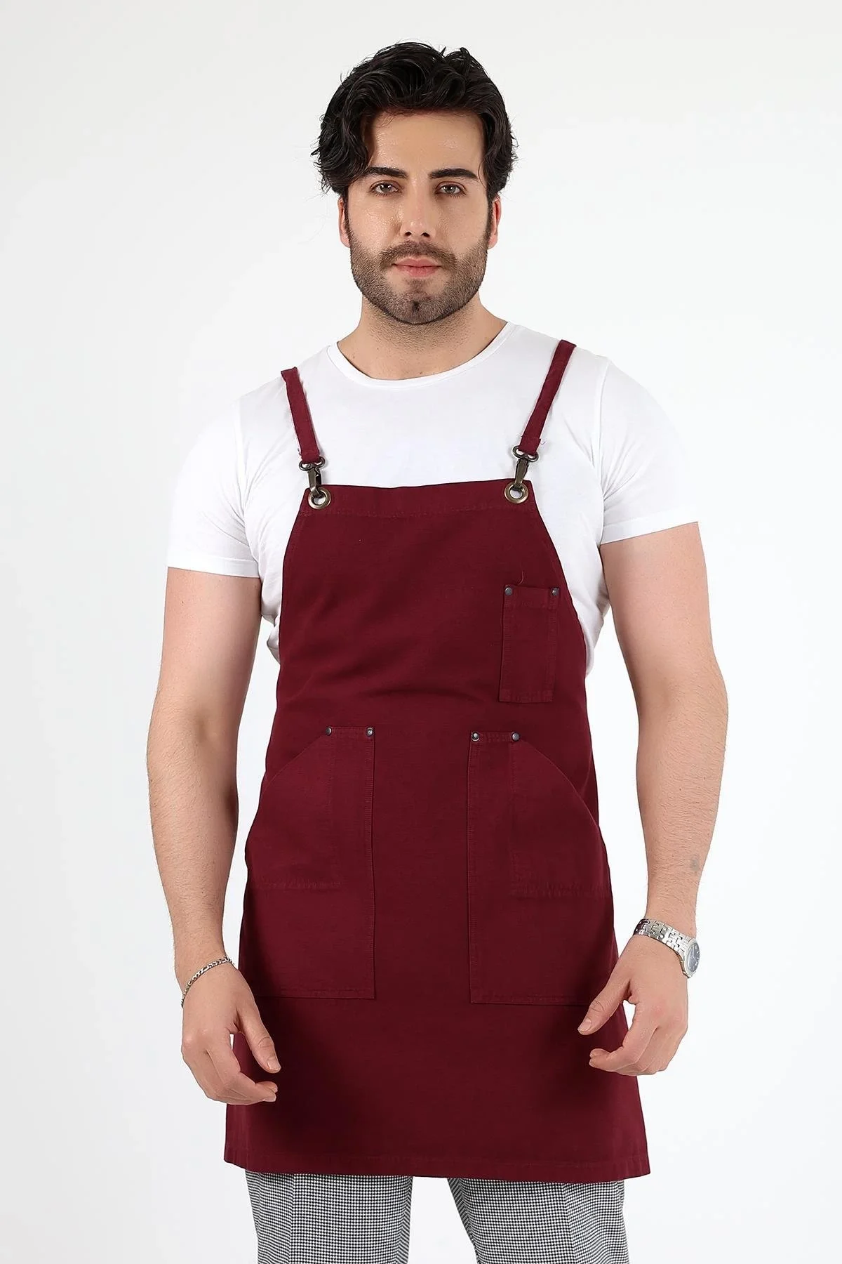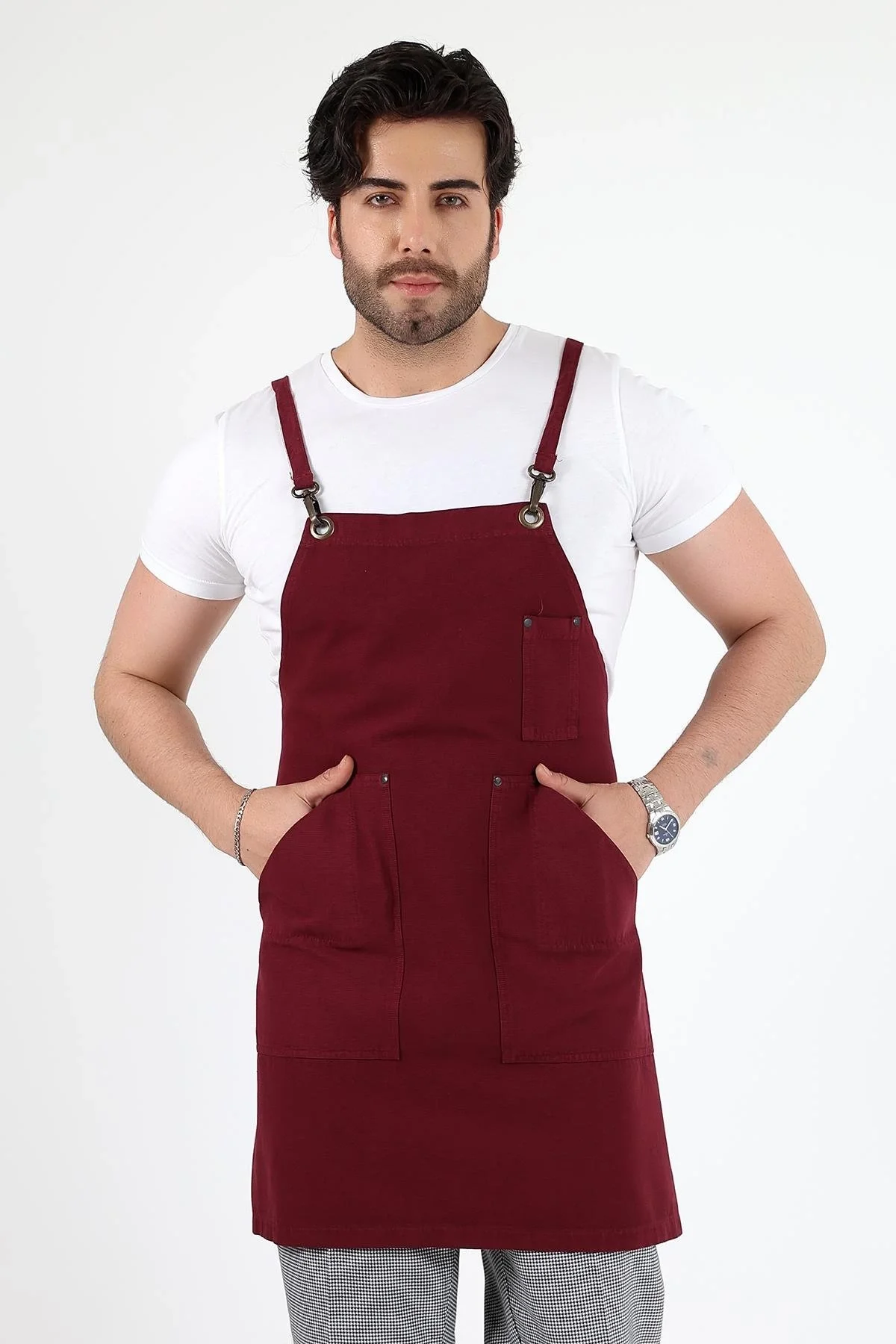 Barista Askılı Önlük Çift Cepli Deri Kemerli Bordo