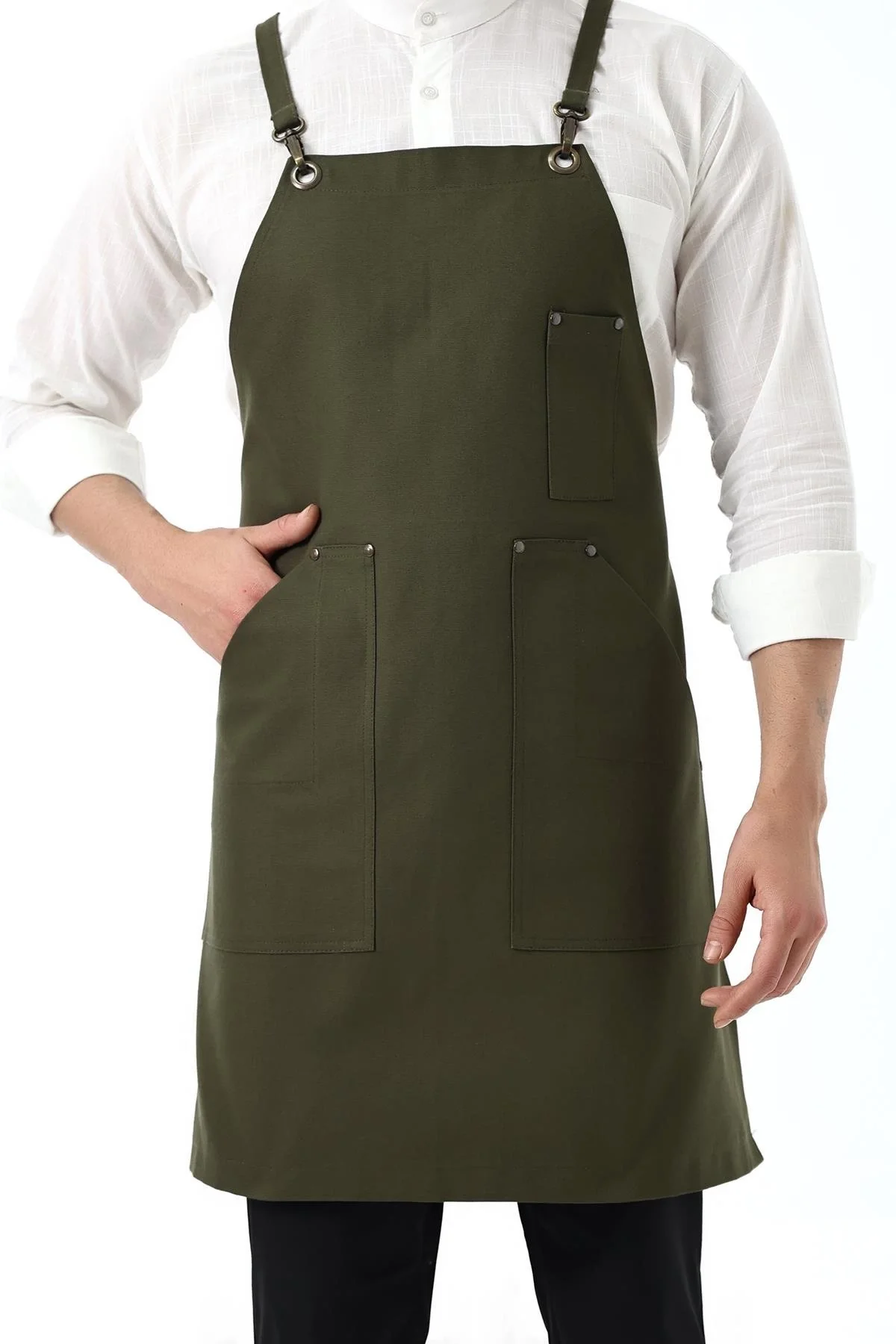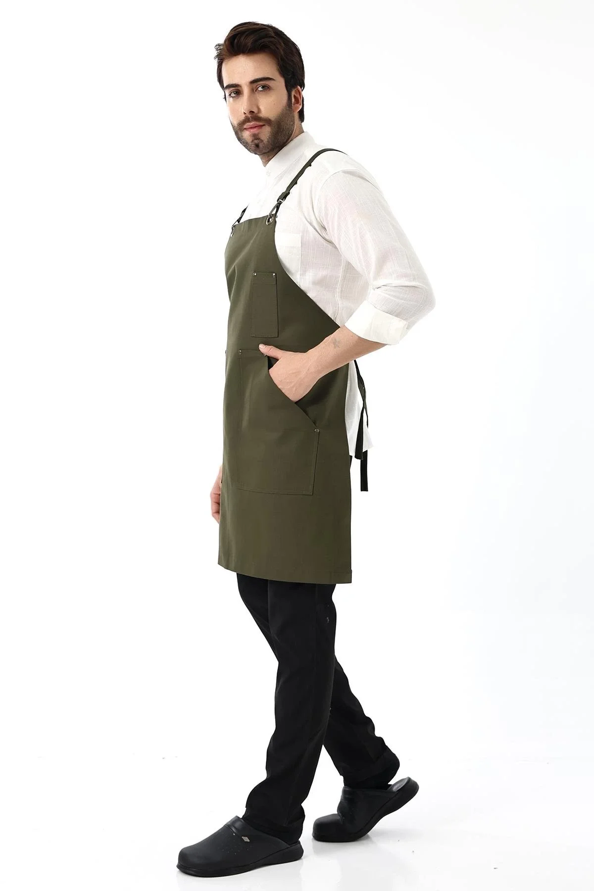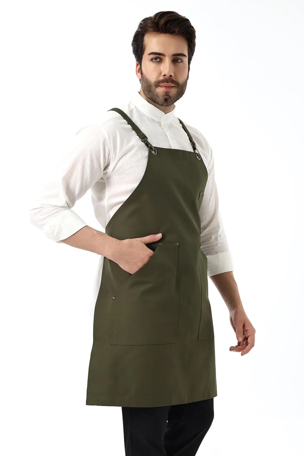 Barista Askılı Önlük Tek Cepli Deri Kemerli - Yeşil
