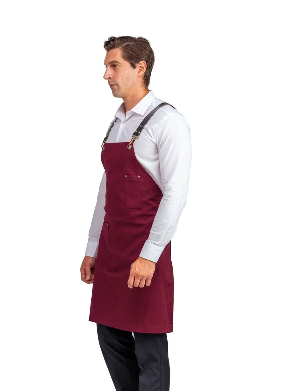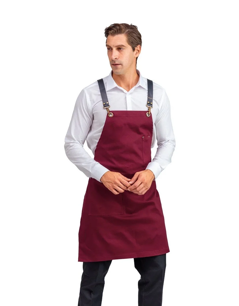 Barista Askılı Önlük Çift Cepli Deri Kemerli Bordo