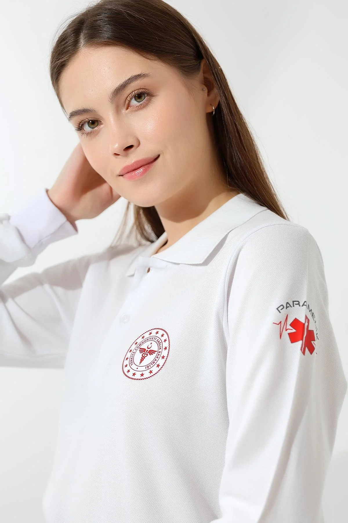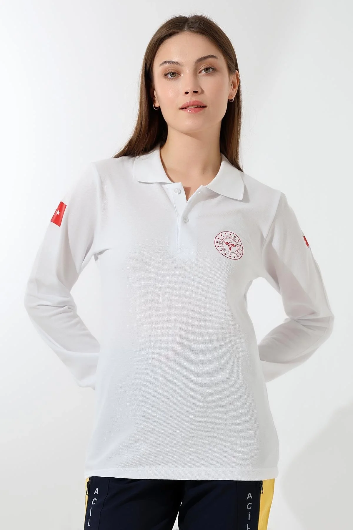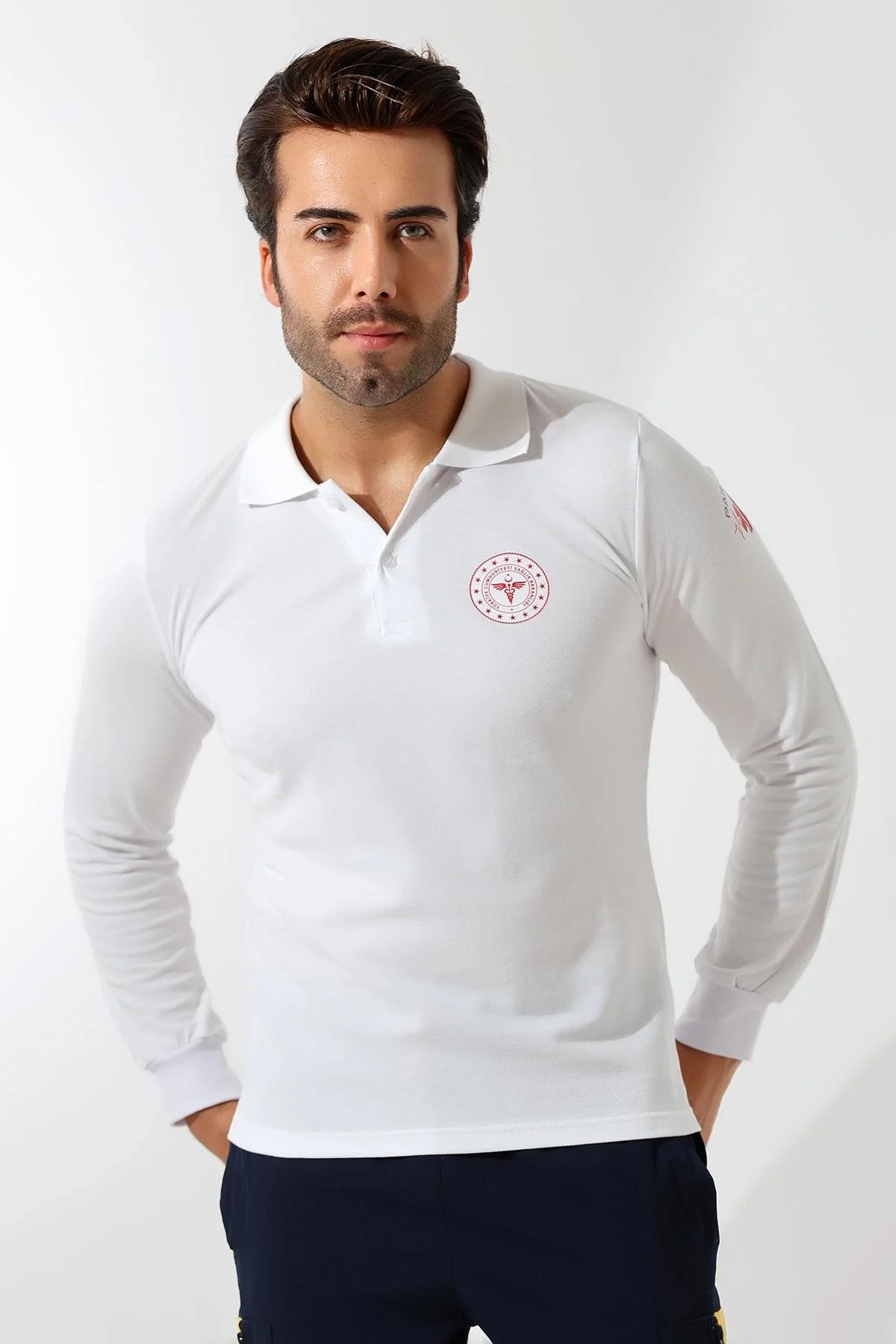 112 Acil Sağlık Yakalı Tshirt Uzun Kol Baskılı - Beyaz