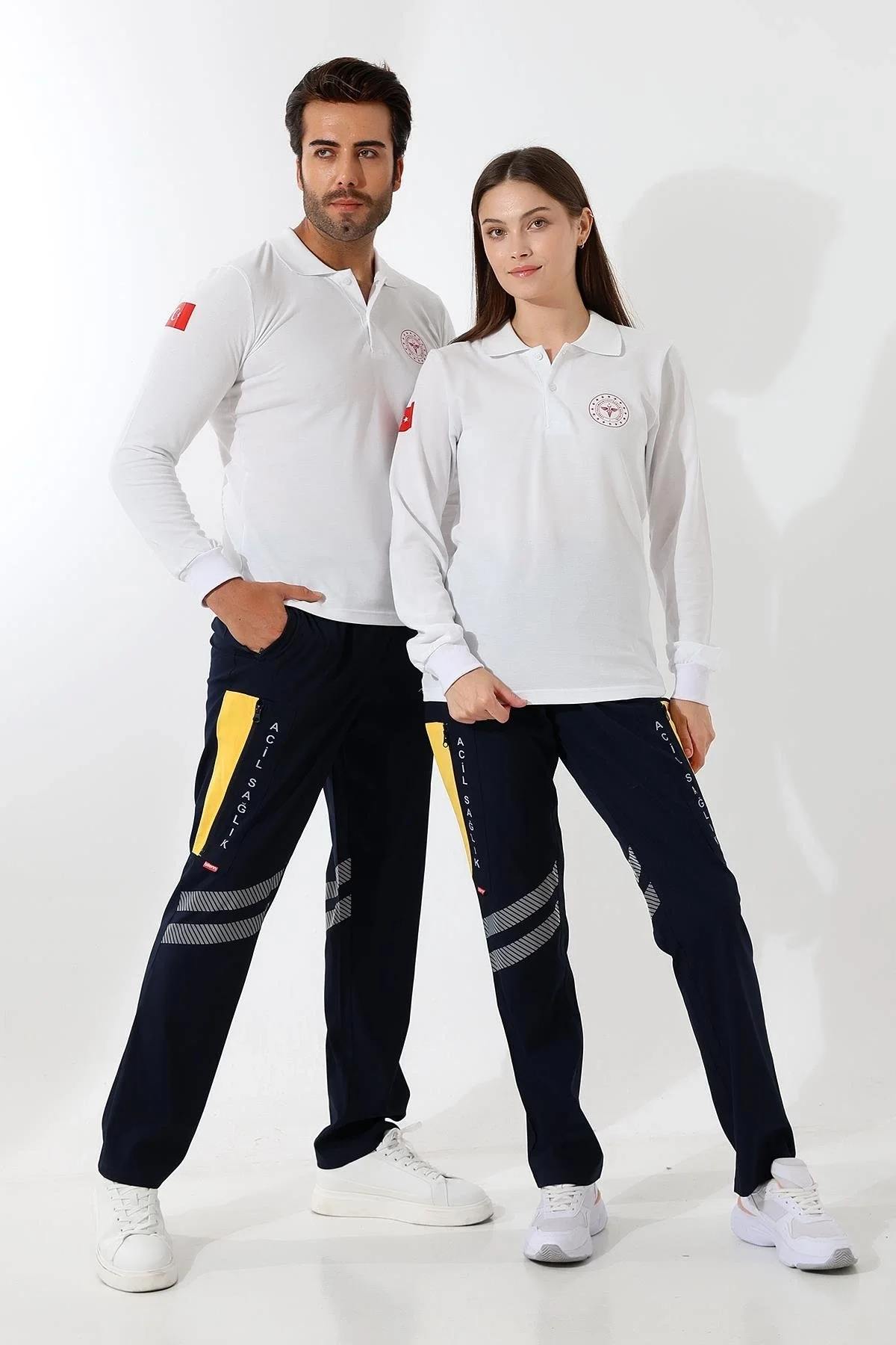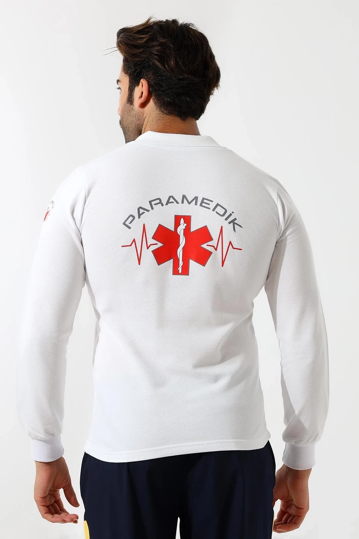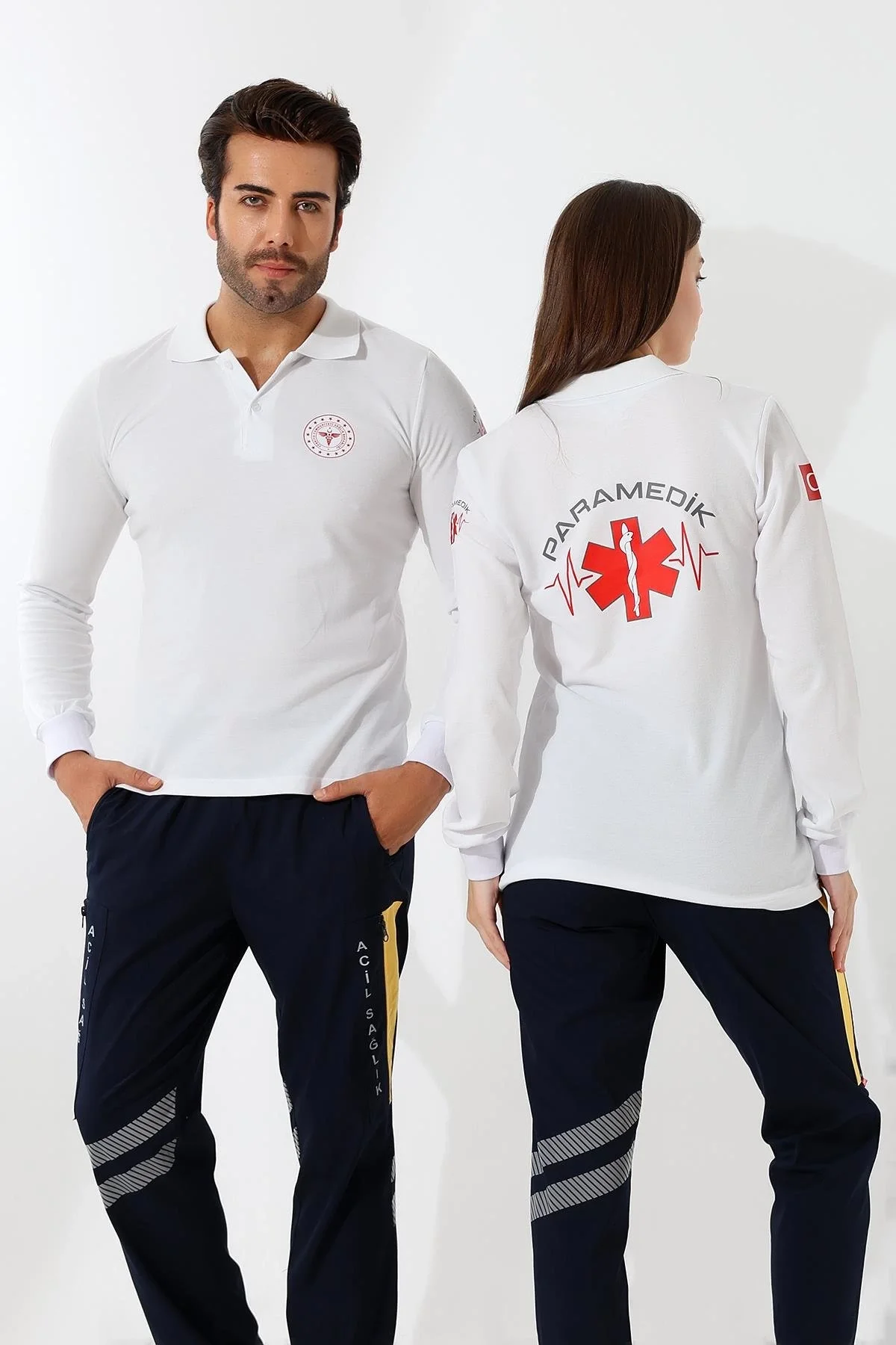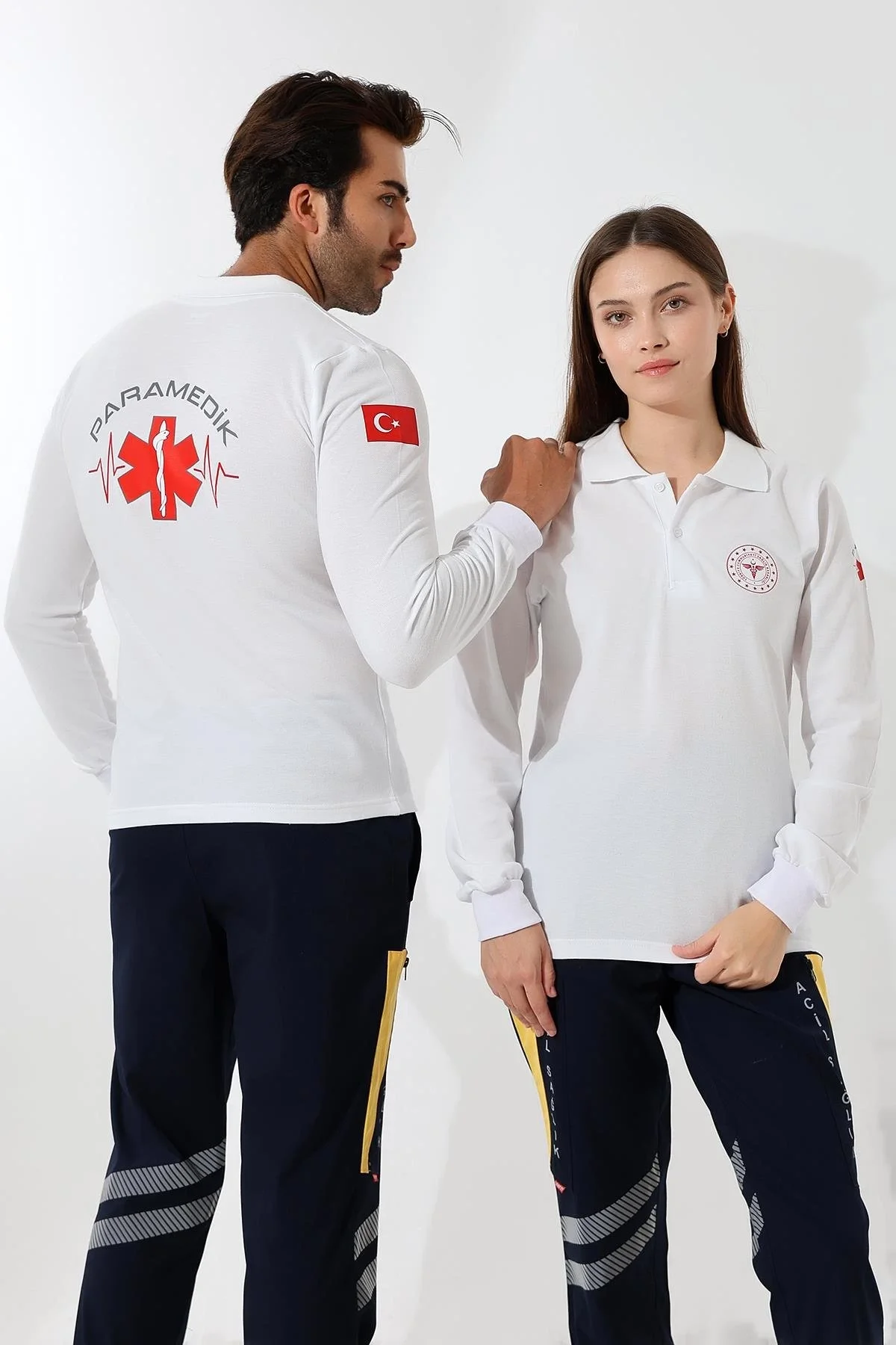 112 Acil Sağlık Yakalı Tshirt Uzun Kol Baskılı - Beyaz
