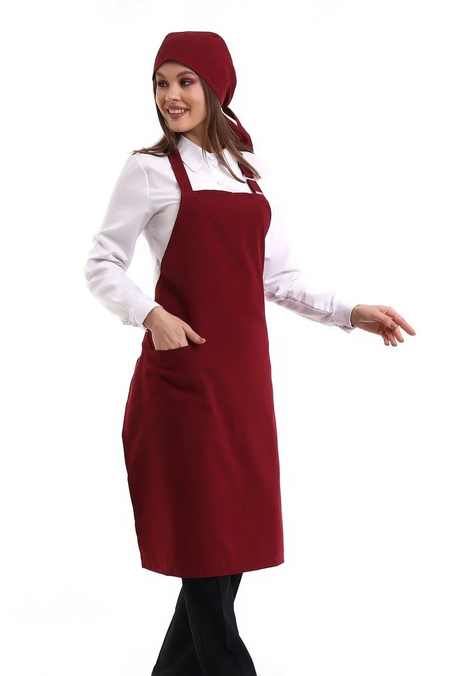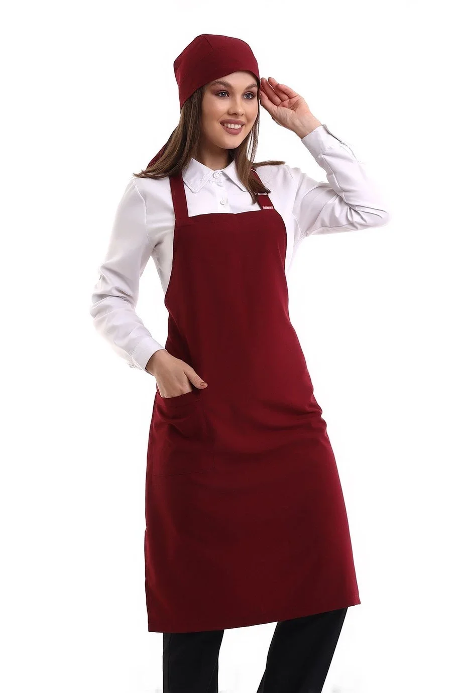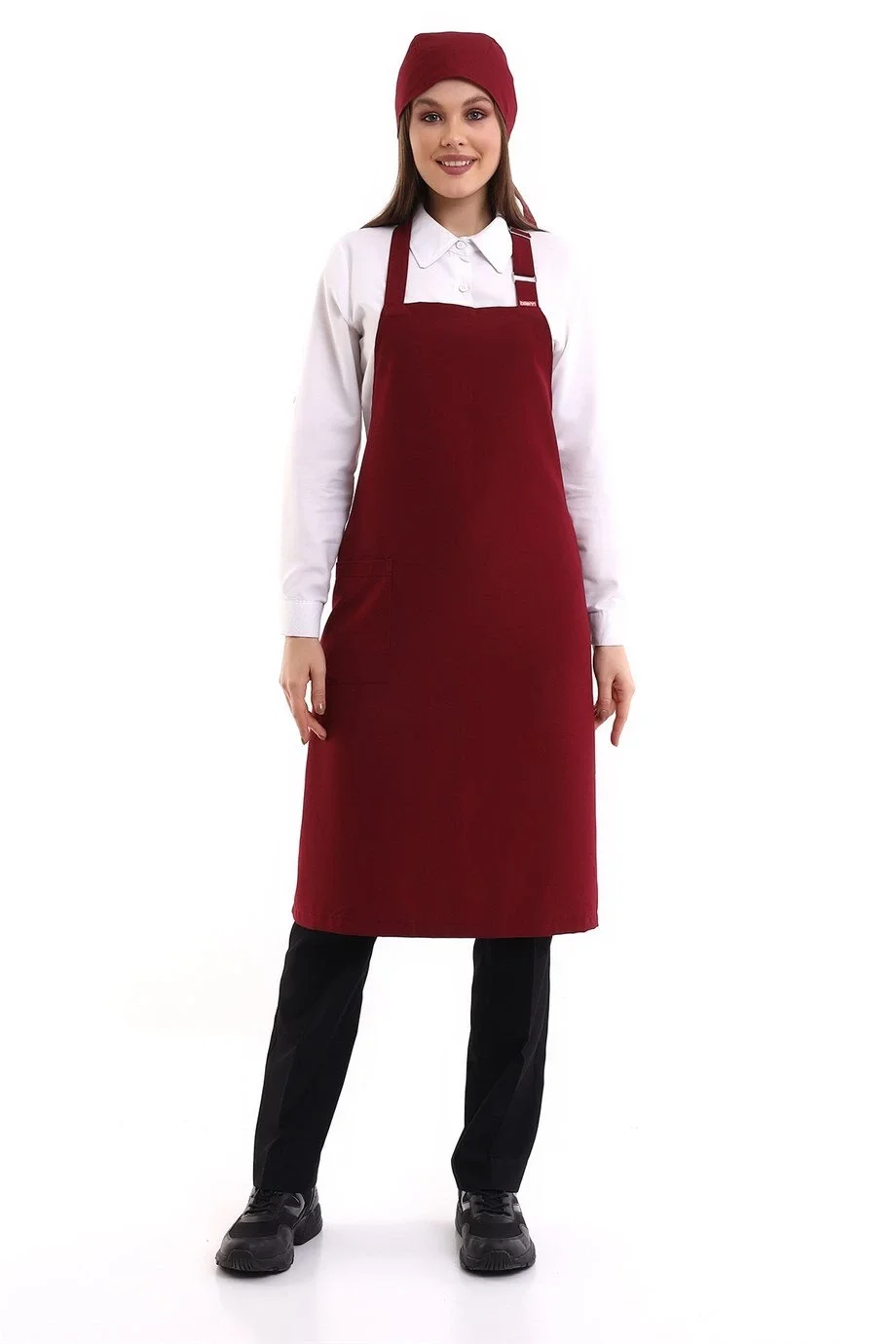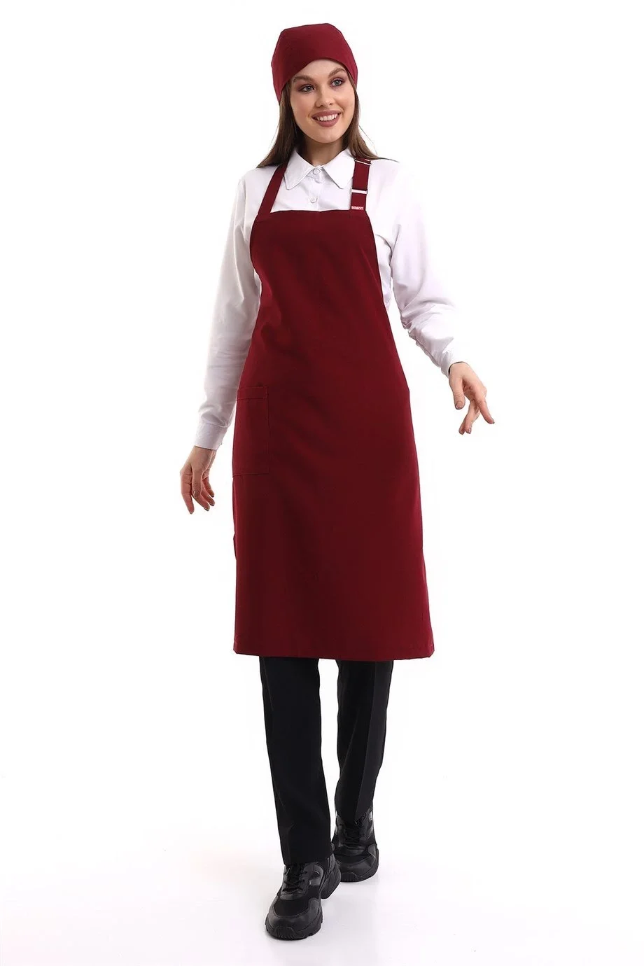 Barista Askılı Önlük Tek Cepli Deri Kemerli - Bordo