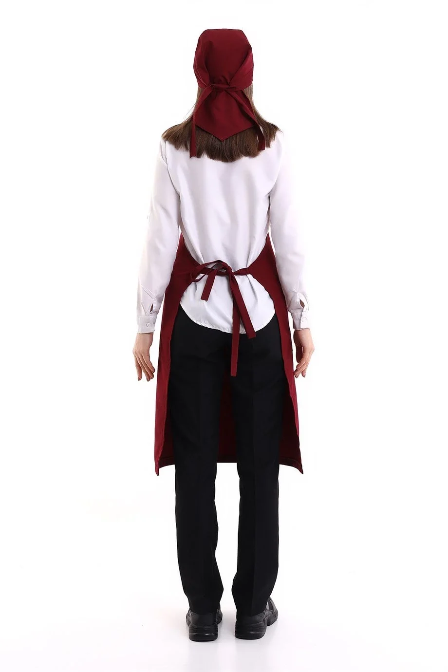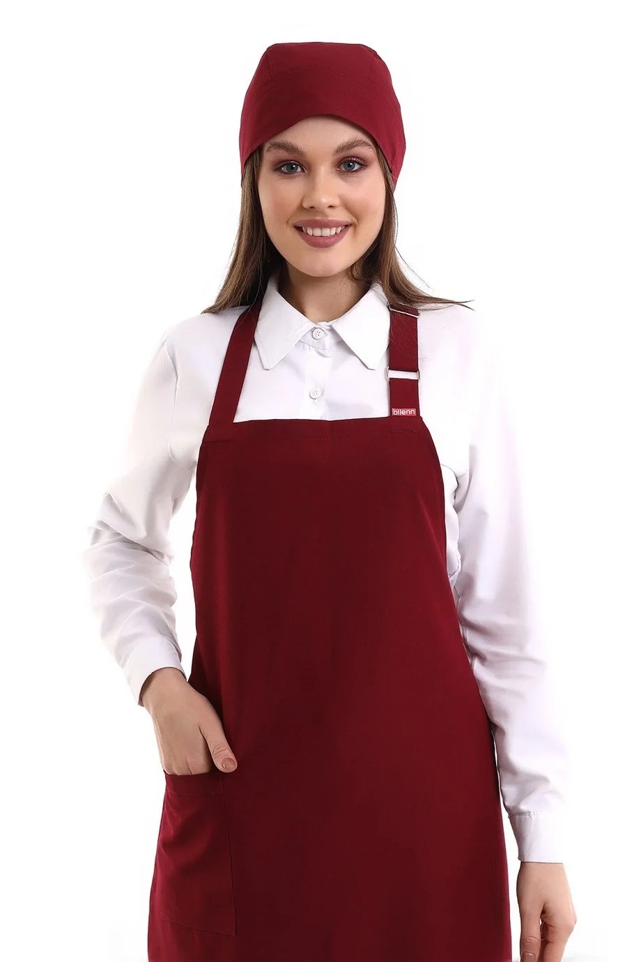 Barista Askılı Önlük Çift Cepli Deri Kemerli Bordo
