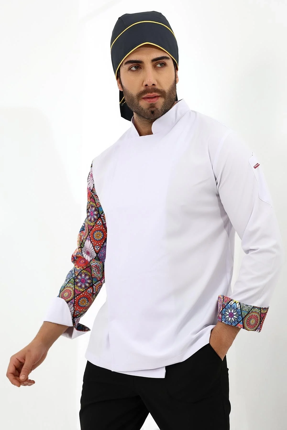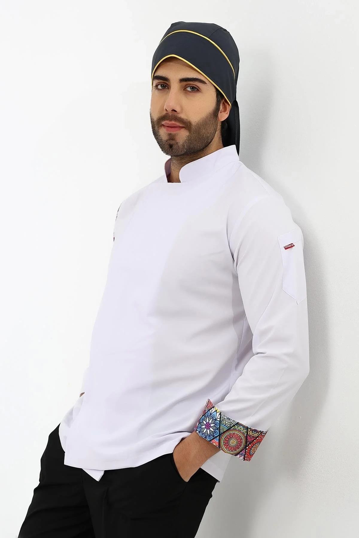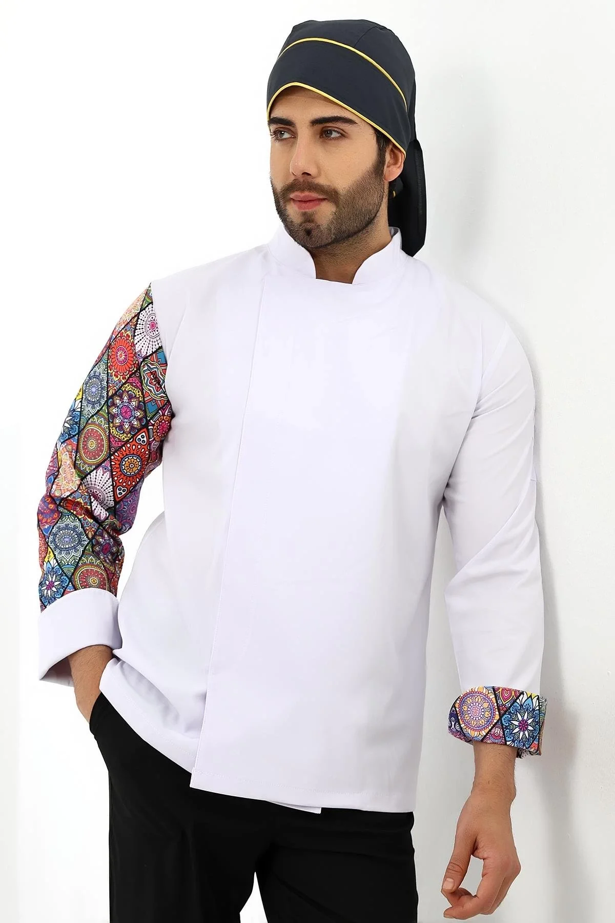 Erkek Likralı Kol Desenli Aşçı Ceket - 6401 Beyaz Renkli Daire